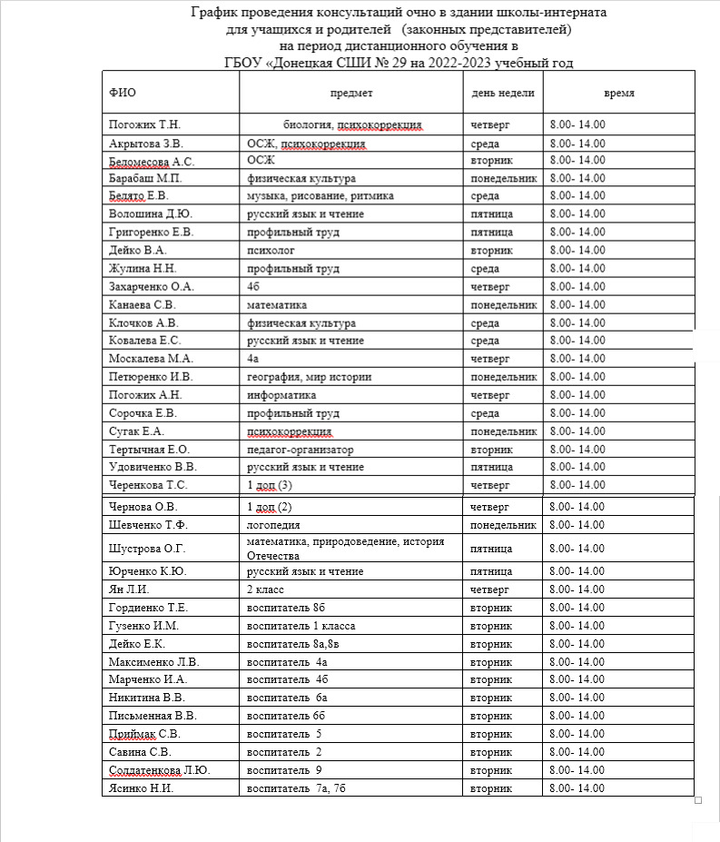 График проведения консультаций очно в здании школы-интерната для обучающихся и родителей (законных представителей) на период дистанционного обучения в ГБОУ Донецкая СШИ №29" на 2022-2023 учебный год.